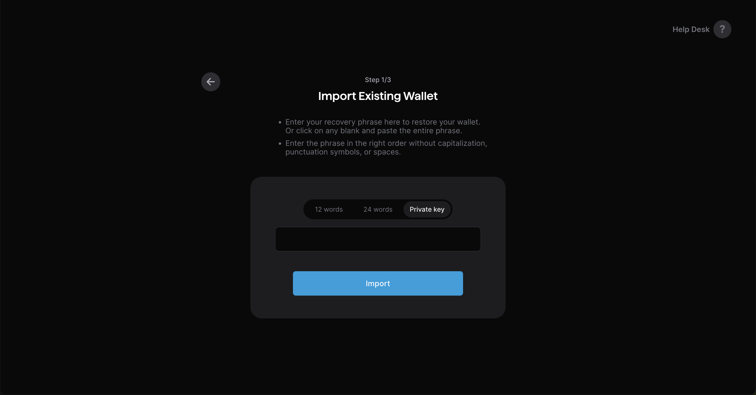 2.4. Choose "Import private key". Do not choose "Import recovery phrase", as the bridge requires direct access to the raw private key to sign transactions and ensure proper interoperability with Ethereum.